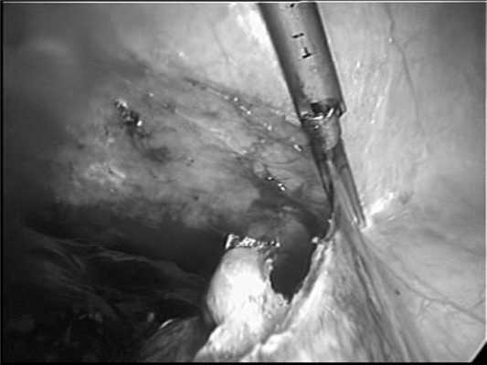 В дальнейшем, в 7 наблюдениях использовали аппарат Ligasure, что было достаточно для надежного гемостаза (см. рисунок, в). Рисунок 1. Этапы лапароскопической спленэктомии. в - пересечение ножки селезенки с помощью аппарата Ligasure.