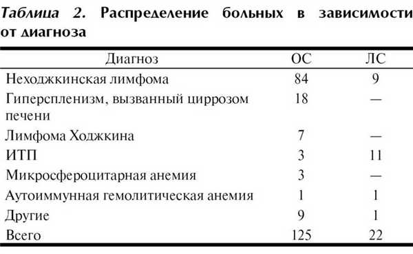 В ретроспективное исследование включены 147 больных с доброкачественными и злокачественными гематологическими заболеваниями и гиперспленизмом, вызванным циррозом печени, которые были оперированы в период 2002-2010 гг. в клинике РВКУБ «Линэзерс». Анализировались амбулаторные карты больных и их истории болезни.