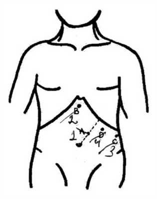 Во время лапароскопической операции больной находился в положении лежа на правом боку под углом 45°, так же с валиком под поясницей. Сначала брюшную полость пунктировали иглой Veressa посредине линии, соединяющей пупок со средней точкой, которая находится чуть ниже реберной дуги, и заполняли CO 2 до 12 мм рт.ст. (см. рис. 1). Рисунок 1. Места расположения троакаров во время лапароскопической операции. Объяснение в тексте. Затем вводили оптический 10-миллиметровый троакар (использовали оптику с углом 30° Olympus optical, Tokyo, Japan). После этого вводили рабочие троакры в эпигастрии слева от печеночной связки (10 мм; см. рис. 2), по linea axillaris anterior под реберной дугой (10 мм; см. рис. 3), по linea medioclavicularis sinistra на 2-3 см ниже реберной дуги (12 мм; см. рис. 4). Все места троакаров можно сдвинуть в зависимости от размера и размещения селезенки в брюшной полости.
