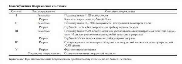В настоящее время общепринятой является классификация повреждений (Organ Injury Scaling), The American Association for the Surgery of Trauma [58]. Раздел, посвященный повреждениям селезенки, опубликован в 1989 г. и пересмотрен в 1994 г. (см. таблицу ).