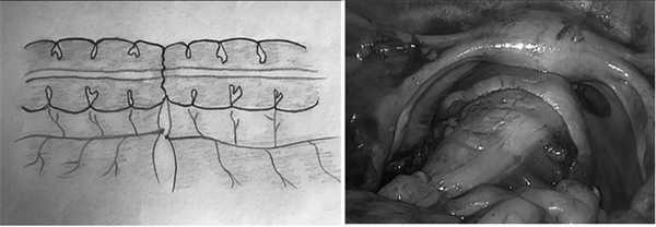 Наиболее распространенный интракорпоральный толстокишечный анастомоз реализуется двумя типами сшивающих аппаратов, обеспечивающих механический шов. Резекция кишки производится прямым линейно-режущим аппаратом, а для наложения анастомоза используется циркулярный сшивающий аппарат. Следует отметить, что линейно-режущий аппарат располагается перпендикулярно оси резецируемой кишки. При создании термино-терминального толстокишечного анастомоза циркулярным аппаратом остаются неперитонизированные участки, так называемые ушки анастомоза, где чаше всего возникает несостоятельность анастомоза [6].