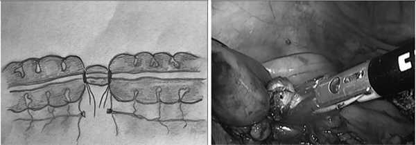 Рис. 4. Формирование атравматического двухрядного аппаратного скрепочного циркулярно-перитонизированного анастомоза.
