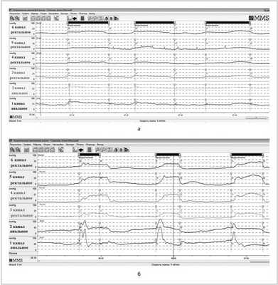 Различают 4 типа ДД [4]: I тип характеризуется парадоксальным повышением давления в области АС при удовлетворительном повышением пропульсивного давления (рис. 1); II тип отличается неудовлетворительным формированием пропульсивного давления и парадоксальным повышением давления в области АС; III тип характеризуется удовлетворительным повышением пропульсивного давления и недостаточным снижением давления в области АС (менее чем на 20% от уровня давления в покое); IV тип отличается сочетанием низкого пропульсивного давления с недостаточным снижением давления в области АС (менее чем на 20% от уровня давления в покое).