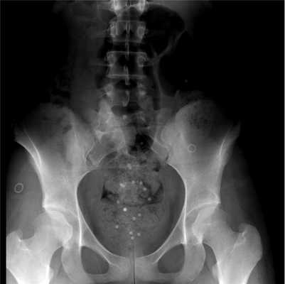 Рис. 2. Рентгенограмма брюшной полости больной С. через 120 ч после приема рентгеноконтрастных маркеров.
