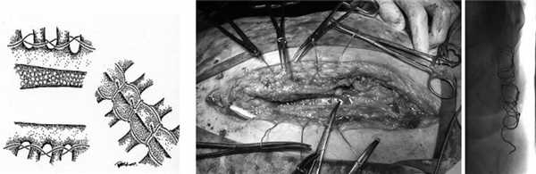 Наиболее часто (у 24 из 48 больных) выполняли операцию - хирургическую обработку раны с резекцией пораженных участков грудины или реберной дуги, реостеосинтез грудины, закрытое проточно-промывное дренирование. При этом производили полное раскрытие стернотомной раны, удаление всех инородных материалов, некротизированных тканей и выполняли стабилизацию грудины металлической проволокой по Robicsek [8] (рис. 1). Рисунок 1. Закрытие грудины по Robicsek.