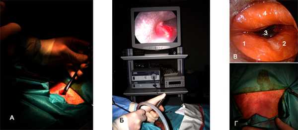 Рис. 6. Видеомедиастиноскопия - диагностическая операция, по результатам которой выбирается тактика лечения, определяется целесообразность хирургического лечения. А - введение медиастиноскопа в средостение через маленький разрез кожи на шее. Б - выполнение биопсии лимфоузлов под контролем видеоизображения. В - эндоскопическая картина во время операции: 1 - левый главный бронх, 2 - правый главный бронх, 3 - бифуркационные лимфоузлы, 4 - легочная артерия. Г - операция завершается наложением косметичного внутрикожного шва, практически незаметного на коже.