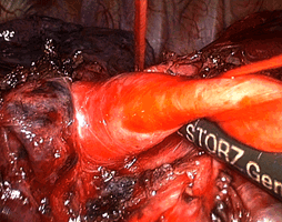 Рис. 7. Малоинвазивная радикальная операция при раке легкого - видеоторакоскопическая нижняя лобэктомия слева, выделение легочной артерии.