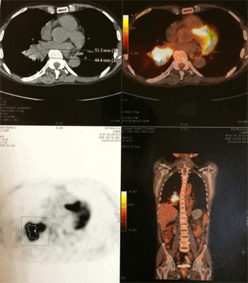 Рис. 3. Позитронная эмиссионная томография пациента О., 72 лет с большой периферической опухолью верхней доли правого легкого. При биопсии - плоскоклеточный рак. При видеомедиастиноскопии - метастазов в лимфоузлах средостения не выявлено. В апреле 2007 года пациент успешно прооперирован в нашем Центре в объеме расширенной верхней лобэктомии справа. При контрольном осмотре в 2013 году состояние больного удовлетворительное признаков, рецидива опухоли нет.