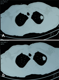 Рис. 5. У пациента К., 65 лет при компьютерной томографии выявлено периферическое образование в верхней доле левого легкого (А, Б). Для окончательной установки диагноза выполнена бронхоскопия с чрезбронхиальной биопсией (В), при которой подтверждена аденокарцинома (злокачественная опухоль) легкого. В марте 2013 года пациент успешно прооперирован в нашем Центре - выполнена расширенная видеоторакоскопическая верхняя лобэктомия слева.
