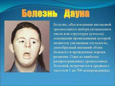 Болезнь Дауна- болезнь, обусловленная аномалией хромосомного набора (изменением числа или структуры аутосом), основными проявлениями которой являются умственная отсталость, своеобразный внешний облик больного и врожденные пороки развития.