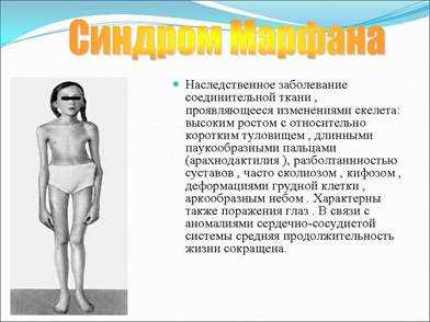 Наследственное заболевание соединительной ткани, проявляющееся изменениями скелета: высоким ростом с относительно коротким туловищем, длинными паукообразными пальцами (арахнодактилия), разболтаннностью суставов, часто сколиозом, кифозом, деформациями грудной клетки, аркообразным небом. Характерны также поражения глаз. В связи с аномалиями сердечно-сосудистой системы средняя продолжительность жизни сокращена.