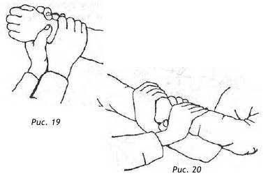 Если противник произвел захват, как показано на рисунке 19 (большие пальцы его рук находятся снизу), возьмитесь правой рукой за левую руку снизу, как показано на рисунке 20, и резко потяните по направлению к своему туловищу.