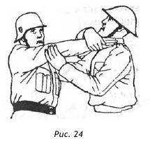 2. Правую руку перебросьте через руки противника и схватите ею противника за запястье правой руки (рис. 24).