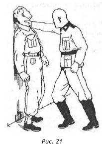 Из этого положения легко повалить противника. Через его плечо давите на его кисть вниз, одновременно развернув свой корпус и навалившись сверху всей тяжестью. Противник потеряет равновесие и упадет (рис. 21).