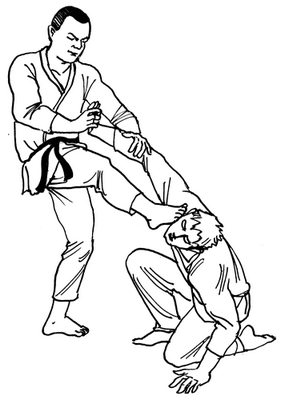 Техника захватов ног руками Завладеть ногой ловкого рукопашного бойца вовсе не так легко, как это принято думать, надо не только схватить ее, но еще и суметь удержать в руках. Приемы эти очень выгодны, благодаря им можно легко свалить противника на землю. 1. Захват ноги,