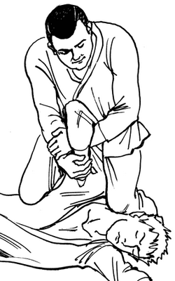 Сядьте, поставив одно колено на голову противника, а другое - на корпус, чтобы ограничить его подвижность (рис. 22). Потянув кисть поверженного врага вверх, вы сможете повредить ему сустав так серьезно, что он не скоро захочет вновь встать у вас на пути - или вообще никогда.