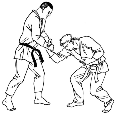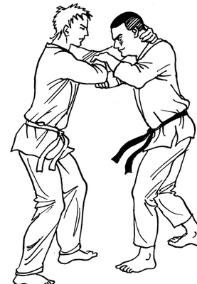 1. Схватите противника за поясницу левой рукой и нанесите ему удар в подбородок, как показано на рисунке 32.