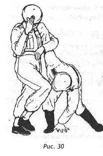 3. Надавите своей левой рукой на его правую руку, заставляя противника освободить захват, и пригните его голову вниз. Затем нанесите сокрушительный удар правым коленом ему в лицо (рис. 30).