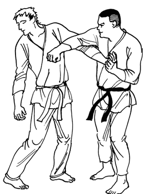 1. Левой рукой захватите снизу правый локоть противника, при этом большой палец вашей левой руки должен быть направлен вправо.