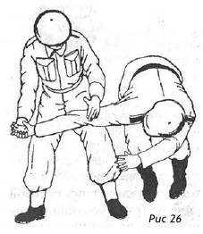 б. Захваты за корпус Захват за одежду на груди - из той же оперы, что и захват за плечо. Накрывай руку нападающего своей, а другой одновременно с шагом назад дави на его предплечье против естественного сгиба (рис.25). Противника поведет вперед, и ты сможешь ударить его ногой