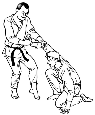 Кистью правой руки захватить правое предплечье нападающего, и, отшагнув правой ногой назад, движением обеих рук вниз вызвать болевое ощущение в запястье, заставляющее противника упасть вперед (рис. 14).