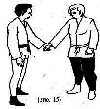 1. Противник захватил вашу правую кисть, как показано на рисунке 15. Согните кисть в запястье и руку в сторону от своего тела, одновременно поворачивая запястье на внешнюю сторону против большого пальца противника (рис. 16).