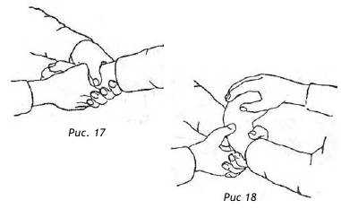 1. Противник произвел захват вашей левой кисти двумя руками, как показано на рисунке 17, причем большие пальцы рук противника находятся сверху. Освобождаясь от захвата, правой рукой возьмитесь за свою левую руку, резко потяните левую руку по направлению к своему туловищу против больших пальцев рук противника (рис. 18).