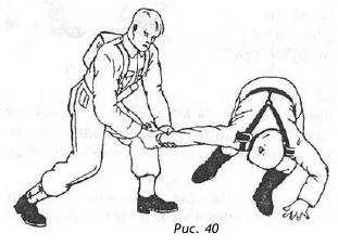 1. Крепко захватите обеими руками правую кисть и предплечье противника, заставляя его удерживать захват в положении, показанном на рисунке 39.