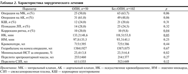 Таблица 2. Характеристика хирургического лечения Примечание. МК — митральный клапан, АК — аортальный клапан, ИК — искусственное кровообращение, ИМ — ишемия миокарда, СЗП — свежезамороженная плазма, КШ — коронарное шунтирование