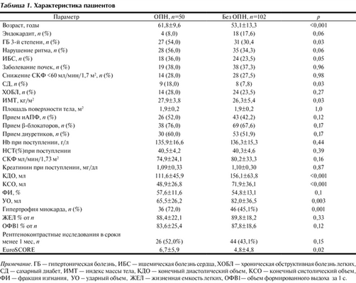 В этом исследовании ОПН диагностирована у 50 (32,8%) больных. Высокая частота встречаемости этого осложнения говорит о клинической значимости выявления предикторов и причин его развития. В ряде исследований [16] показано, что операции на клапанах сердца ассоциированы с повышенным риском развития ОПН, в отличие от изолированного коронарного шунтирования (КШ). В то же время широко обсуждается вопрос о взаимосвязи мультифокального атеросклероза, повышения АД и развития ОПН [5, 9]. В нашем исследовании было показано, что ГБ 3-й степени встречалась чаще у пациентов с ОПН (p=0,03). Учитывая, что тяжелая гипертоническая болезнь приводит к прогрессированию атеросклеротического процесса и нарушению тканевой перфузии, считаем необходимым проводить коррекцию уровня АД перед хирургическим лечением пациентов.