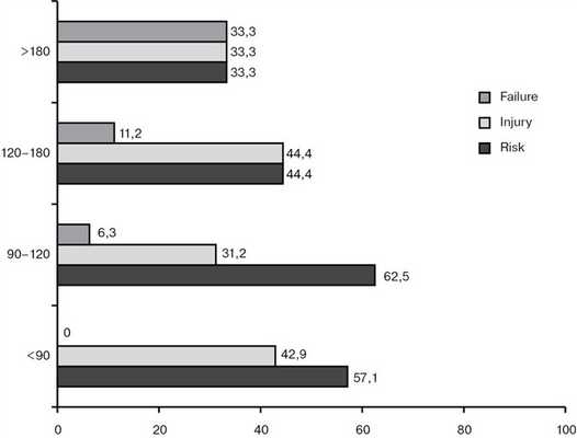 Для ответа на вопрос, «зависит ли тяжесть ОПН от длительности ИК?», мы составили схему (см. рис. 1), разделив все случаи дисфункции на группы относительно времени И.К. Из представленной схемы видно, что в пределах 90 мин ИК развиваются только первые две стадии осложнений, примерно с равной частотой. В дальнейшем, при увеличении длительности ИК начинает нарастать частота 3-й стадии ОПН, и после 3 ч тяжесть почечной дисфункции достигает своего максимума. При такой длительности только в 1/3 случаев почки находятся в стадии risk, которая не ухудшает ближайших послеоперационных результатов.