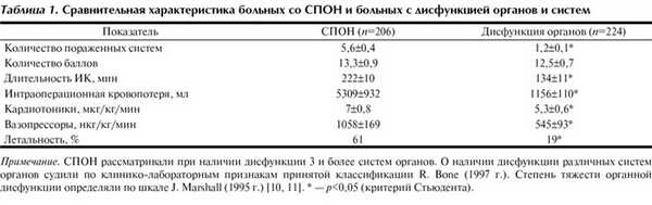 По количеству пораженных органов и систем, а также причинам, приводящим к возникновению СПОН, больные были разделены на 2 группы: 1-я (n=275) - с поражением более 5 органов и систем (длительный период ИК с кровопотерей, массивная кровопотеря, ИМ/КГШ, ДВС-синдром, анафилактический шок), 2-я (n=155) - с поражением 3-5 органов и систем (аллергические реакции, СОПЛ, гемолиз, длительный период ИК).