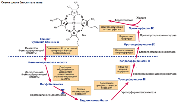 Гем представляет собой комплексное соединение порфиринов с двухвалентным железом. Наибольшее количество гема образуется в печени и костном мозге. В печени гем входит в состав белков, участвующих в клеточном дыхании, расщеплении токсичных свободных радикалов и обезвреживании различных ксенобиотиков. В костном мозге гем используется для образования гемоглобина. Результатом сниженной активности ферментов является торможение синтеза гема на определенном уровне, что ведет к накоплению его токсичных промежуточных метаболитов.