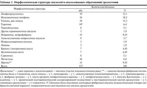 За период с 1992 по 2012 г. чрескожное УЗИ органов грудной клетки было выполнено 157 пациентам с опухолями и опухолевидными образованиями средостения, которым впоследствии произведена лечебная и/или диагностическая операция. Морфологическая характеристика опухолей у оперированных больных представлена в табл. 1.