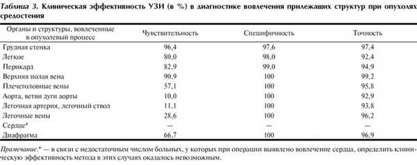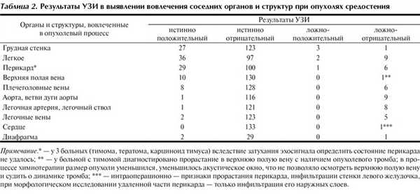 При опухолях средостения чрескожное УЗИ является эффективным методом диагностики вовлечения прилежащих структур в опухолевый процесс (чувствительность, специфичность и точность для грудной стенки составляют 96,4, 97,6 и 97,4%; для легкого — 80, 98 и 92,4%; для перикарда — 82,9, 99 и 94,9%; для верхней полой вены — 90,9, 100 и 99,2%; для диафрагмы — 66,7, 100 и 96,9% соответственно). Несмотря на объективные ограничения метода, ультразвуковые данные служат ценным подспорьем хирургу при проведении операции. Небольшое количество ложноположительных заключений при УЗИ не ведет к необоснованному отказу от хирургического лечения.