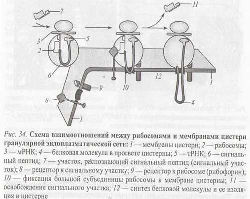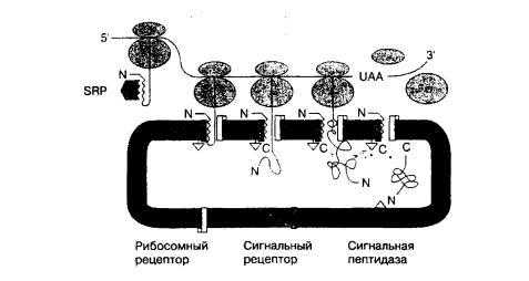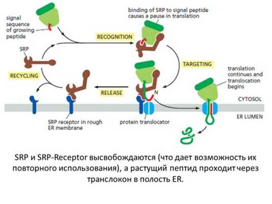 Пауза в трансляции длится до тех пор, пока захватившая рибосому частица не свяжется с SRP-рецептором , находящемся на цитоплазматической стороне мембраны шероховатого ЭР . Он взаимодействует с SRP-связанными рибосомами таким образом, что частица меняет свое положение, и трансляция возобновляется. Одновременно рибосома связывается с мембраной ЭР, и растущая на ней полипептидная цепь переносится к системе транслокации в мембране. Эта система изучена плохо, известно только, что она включает белок-рецептор второго сигнального пептида, отличающийся от SRP. По- видимому, ее роль заключается в связывании рибосомы, на которой синтезировался сигнальный пептид ЭР, с мембраной ЭР; участвует она и в последующем переносе белка через мембрану.