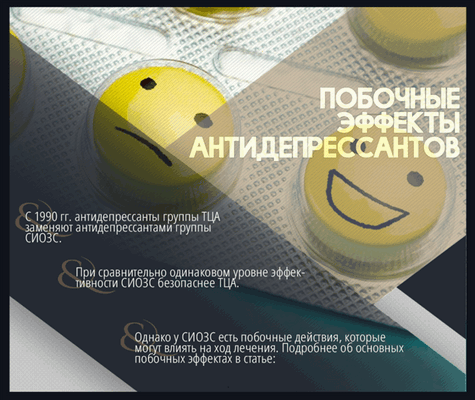 Переносимость и побочные эффекты - это разные, но весьма тесно связанные понятия. Одной из основных причин прекращения лечения антидепрессантами является сила их побочных действий. 43 % больных депрессией прекращают прием антидепрессантов из-за побочных действий. Пациенты, принимающие ТЦА, чаще обрывают курс лечения и чаще сталкиваются с побочными эффектами, по сравнению с пациентами, принимающими СИОЗС.