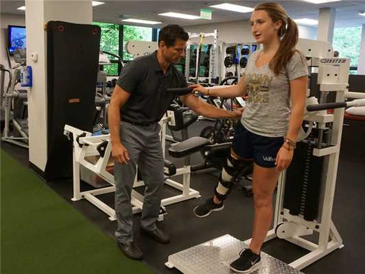 Затем пациенты начинают заниматься на современных тренажёрах, которыми оснащена клиника реабилитации Юсуповской больницы. Они позволяют постепенно, с минимальными неприятными ощущениями увеличивать амплитуду движения коленного сустава. Пациент накачивает манжету вокруг колена воздухом, и нога распрямляется за счёт оказываемого давления.