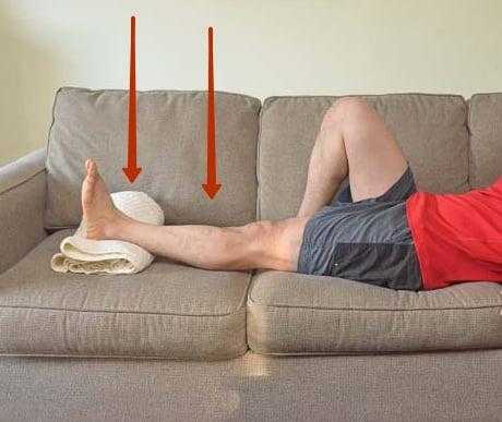 Лёжа на спине, подкладывают под стопу валик, сделанный из полотенца, надавливают на него, пытаясь согнуть конечность. Через 5 секунд можно расслабиться. Напрягаться будут мышцы голени и связки подколенной зоны.