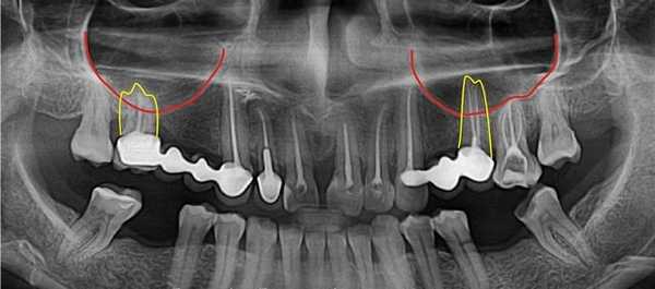 - анатомические особенности зубов и челюстей: расположение корней премоляров и моляров в полости пазухи, длинные расходящиеся корни, атрофия костной ткани;