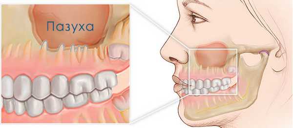 Обычно корни зубов верхней челюсти отделяются от дна пазух костной пластиной. В области расположения первых 2 коренных единиц пластина имеет толщину всего 0,2-1,2 миллиметра. В некоторых случаях отмечается вдавливание верхушек таких зубов в пазухи. Кроме того, может наблюдаться их выступ дальше пазухового дна.