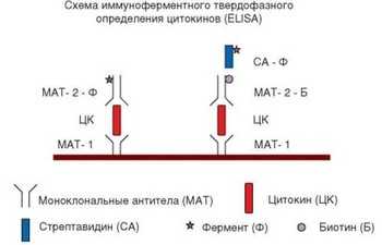 Рис. 3.26. Схема иммуноферментного твердофазного определения антигена (ELISA) на примере цитокина. Коричневая полоса — пластиковая поверхность, на которую последовательно наслаивают указанные реагенты
