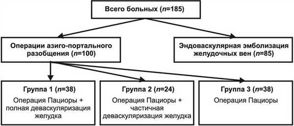 Всего в исследование включены 185 пациентов с клинически и гистологически подтвержденным диагнозом ЦП. 100 больным была выполнена операция АПР из абдоминального доступа, 85 - чрескожная чреспеченочная эмболизация вен желудка. Из 100 больных, которым произведена операция АПР, 62 в дополнение к операции М.Д. Пациоры была выполнена деваскуляризация желудка, остальным 38, составившим контрольную группу, - только операция М.Д. Пациоры. Не всем пациентам удалось произвести предполагаемый объем деваскуляризации, поэтому в свою очередь 62 пациента были разделены на 2 группы: 1-я - полная деваскуляризация (n=38), 2-я - частичная деваскуляризация (n=24). Таким образом, 100 больных разделены на 3 группы (рис. 1). Рисунок 1. Распределение пациентов по характеру хирургических вмешательств.