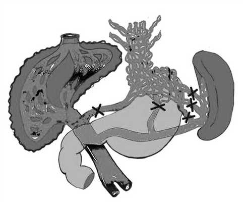 Среди арсенала возможных хирургических вмешательств с целью лечения и профилактики гастроэзофагеальных кровотечений наибольшее распространение получили различные варианты портокавальных анастомозов (ПКА) и операции азиго-портального разобщения (АПР) [4, 8, 9, 12-14]. Ортотопическая трансплантация печени в России не может претендовать на роль основного метода хирургического лечения больных циррозом печени (ЦП) и портальной гипертензией (ПГ) [1, 2].