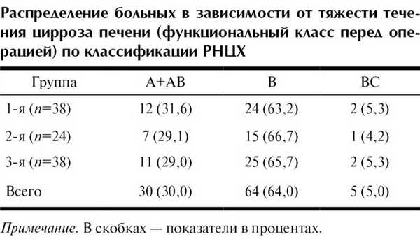 Выбор метода лечения таких больных базируется на функциональном состоянии печени и наличии или отсутствии кровотечения. Всех больных мы разделили на 5 групп согласно критериям Г.В. Манукьяна [11] (см. таблицу).