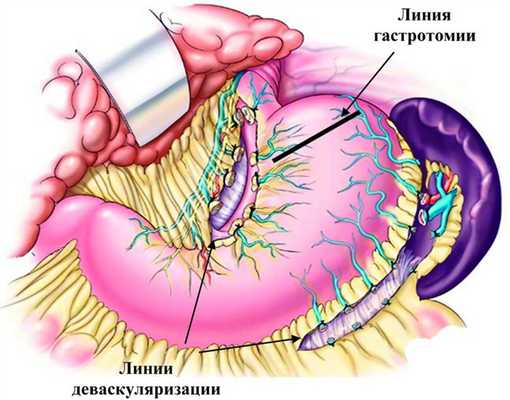 Применение многими авторами технологии деваскуляризации пищевода и желудка предусматривает пристеночное пересечение связочного аппарата вдоль малой и большой кривизны желудка, при этом стволовая часть регионарных коллекторов - ЛЖВ и ЗЖВ - остается интактной, что способствует более быстрой венозной реваскуляризации в местах пересечения и образованию вторичных ВРВ.