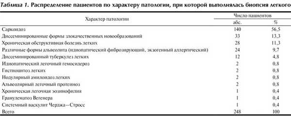 В отделении торакальной хирургии кафедры и клиники хирургии ИПО Самарского государственного медицинского университета и Самарской областной клинической больницы им. М.И. Калинина видеоторакоскопические операции выполняются с 1999 г. За этот период выполнены 267 видеоторакоскопических и 116 видеоассистированных резекций легких. Диагностические резекции легочной ткани с целью биопсии выполнялись при диффузных процессах в легких (248 пациентов). Целью таких операций была морфологическая верификация заболевания легких. В результате хирургической диагностики выявлены злокачественные процессы легких у 33 (13,3%) пациентов, туберкулез — у 12 (4,8%), хроническая обструктивная болезнь легких — у 28 (11,3%), различные виды диссеминированных и интерстициальных заболеваний легких — у 175 (70,6%). Распределение оперированных пациентов в зависимости от установленного диагноза представлено в табл. 1.