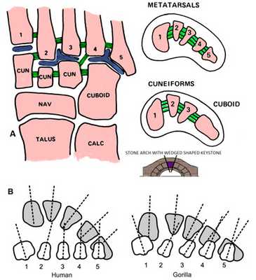 Кости стопы формируют продольную и поперечную арки или своды. Продольная арка находится в сагиттальной плоскости и имеет протяженность от пяточного бугра до плюсне-фаланговых суставов. Продольный свод стопы состоит из внутренней и наружной арок. Внутренняя арка включает в себя 5 костей: пяточная, таранная, ладьевидная, 1 клиновидная и 1 пястная. Наружная арка состоит их трех костей: пяточная, кубовиидная, 5 плюсневая. Свод имеет форму арки, которая образована жесткими костными полудугами и основанием в виде подошвенного апоневроза.