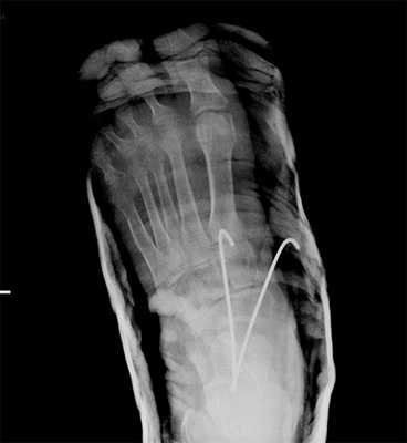 Рис. 10. Чрезкожная фиксация костей предплюсны после вправления вывиха в суставе Шопара, стопа в гипсовой лонгете