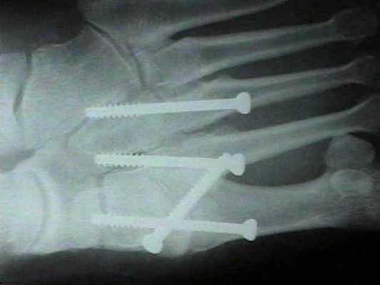 Удаление винта производится через 6-12 месяцев после операции. В случае формирования болезненного посттравматического артрита 2 предплюсне-плюсневого сустава также показано выполнение его артродеза.